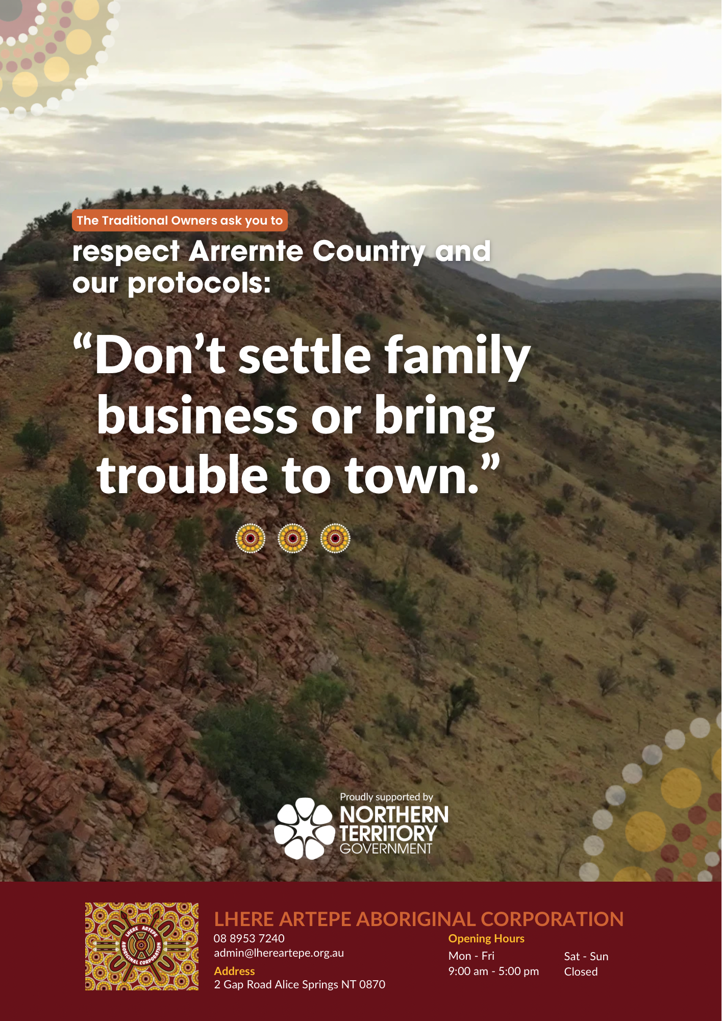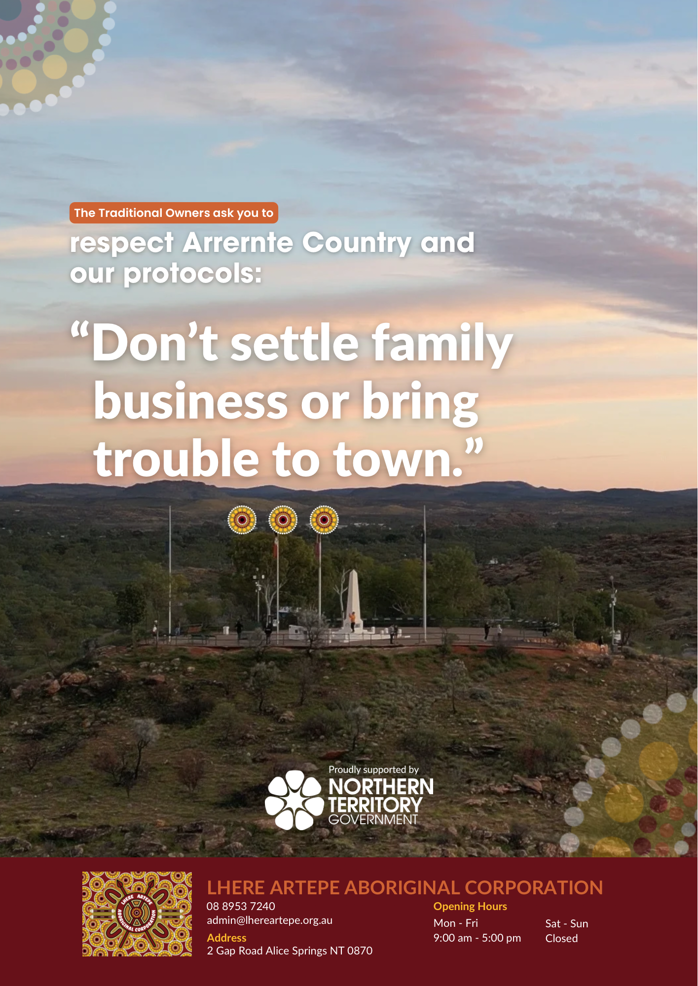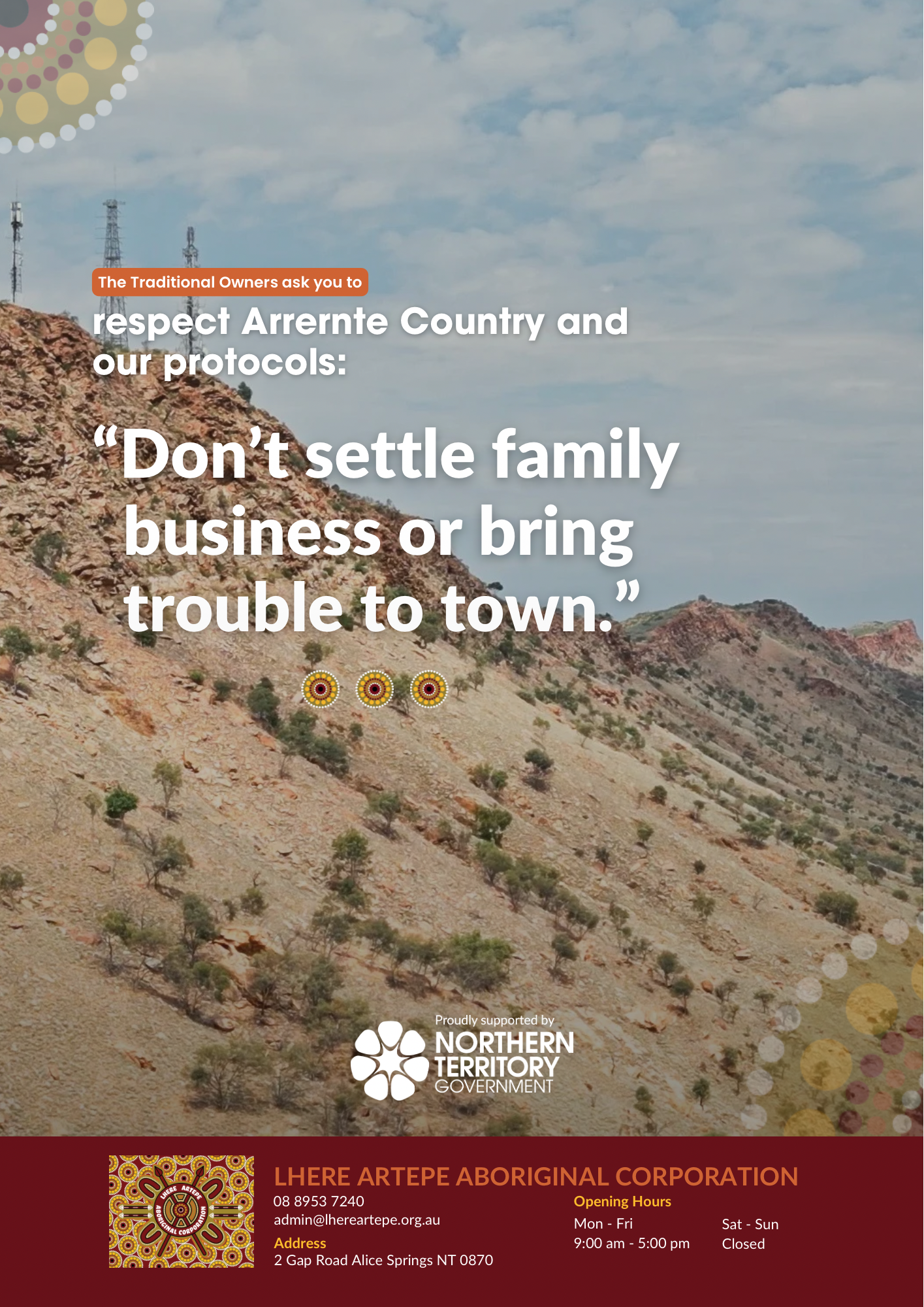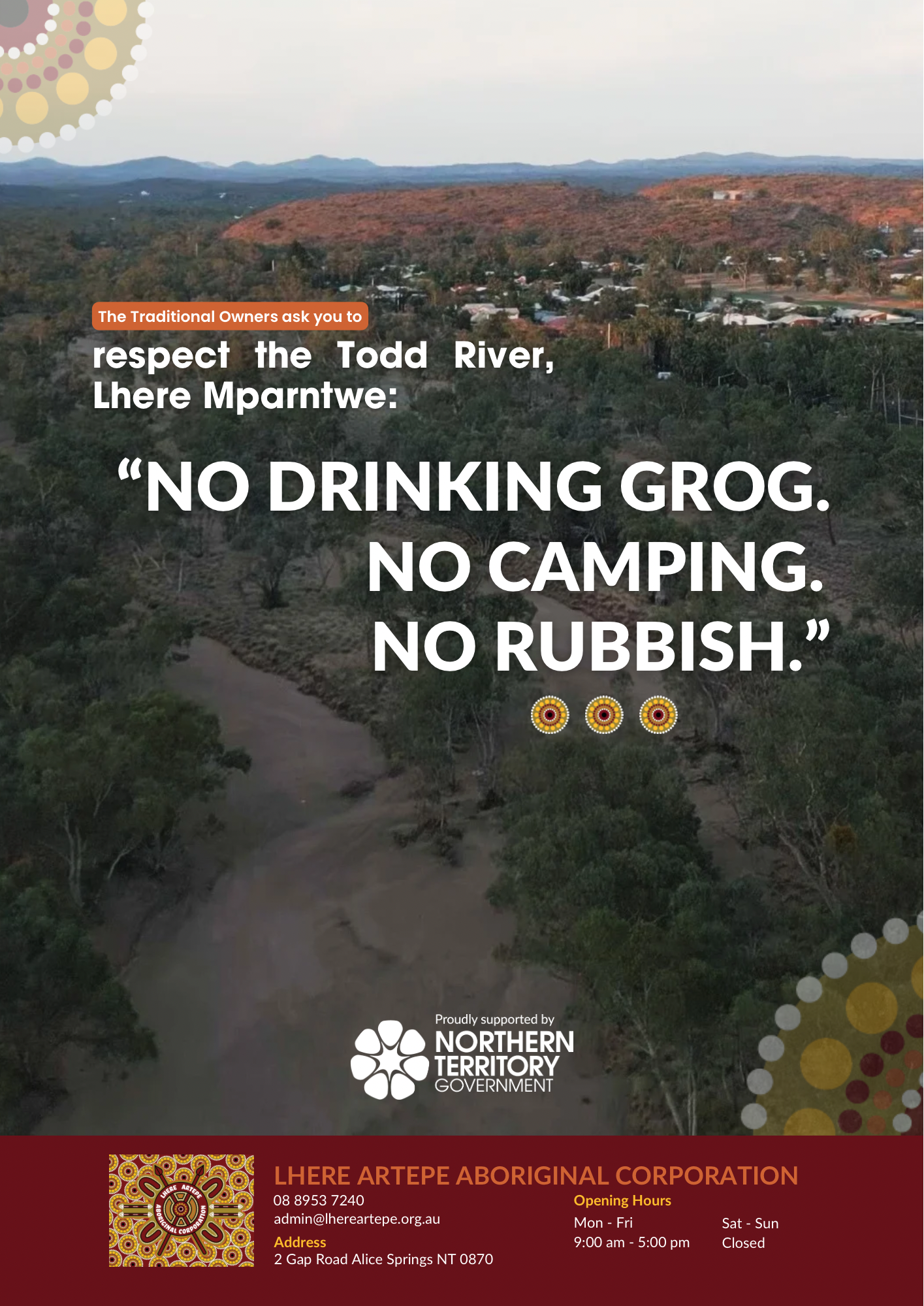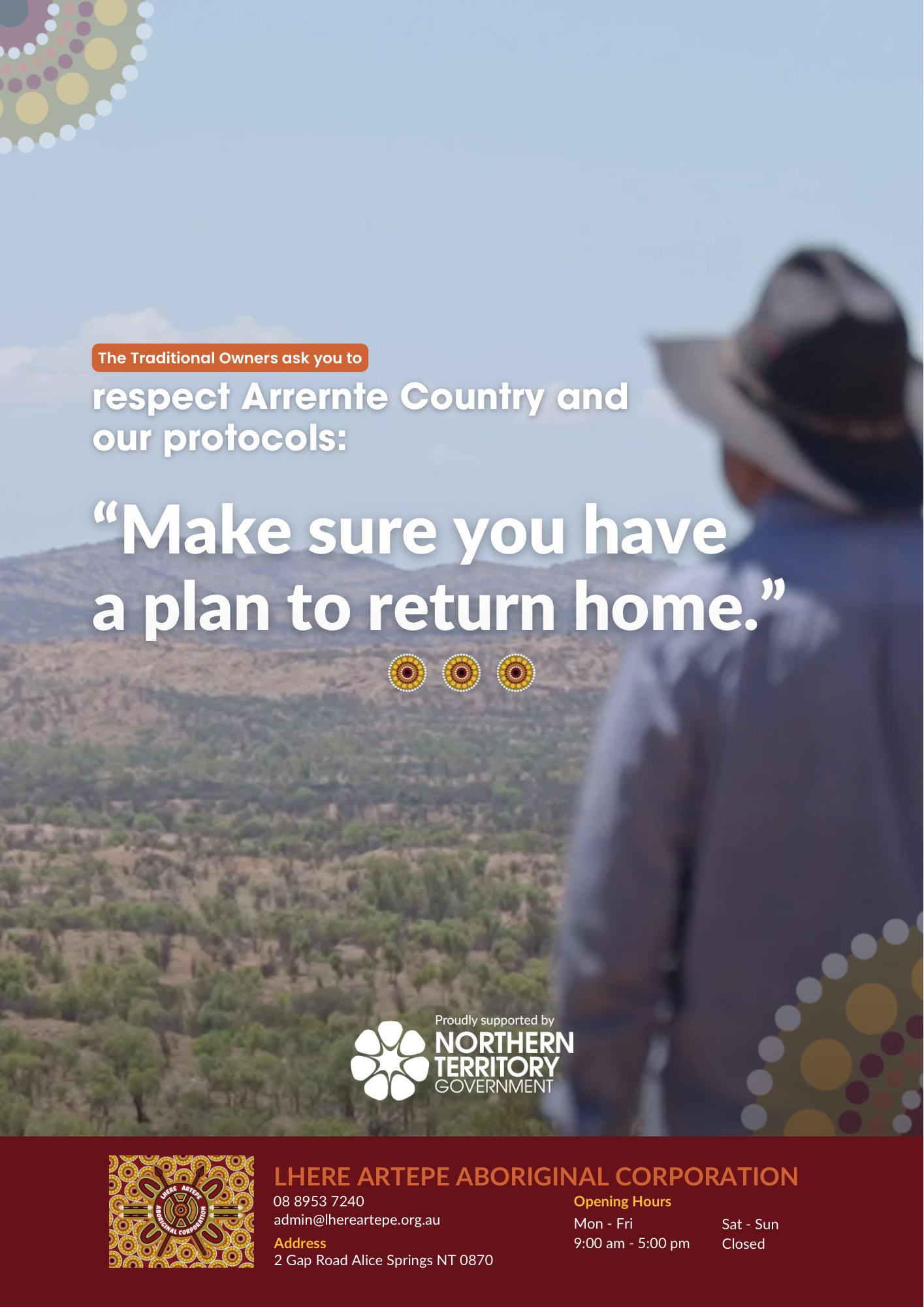 Lhere Artepe Aboriginal Corporation is the Registered and recognised Prescribed Body Corporate representing the Native Title Holders of Alice Springs following their court determination ruling and registered Incorporated body in 2002.