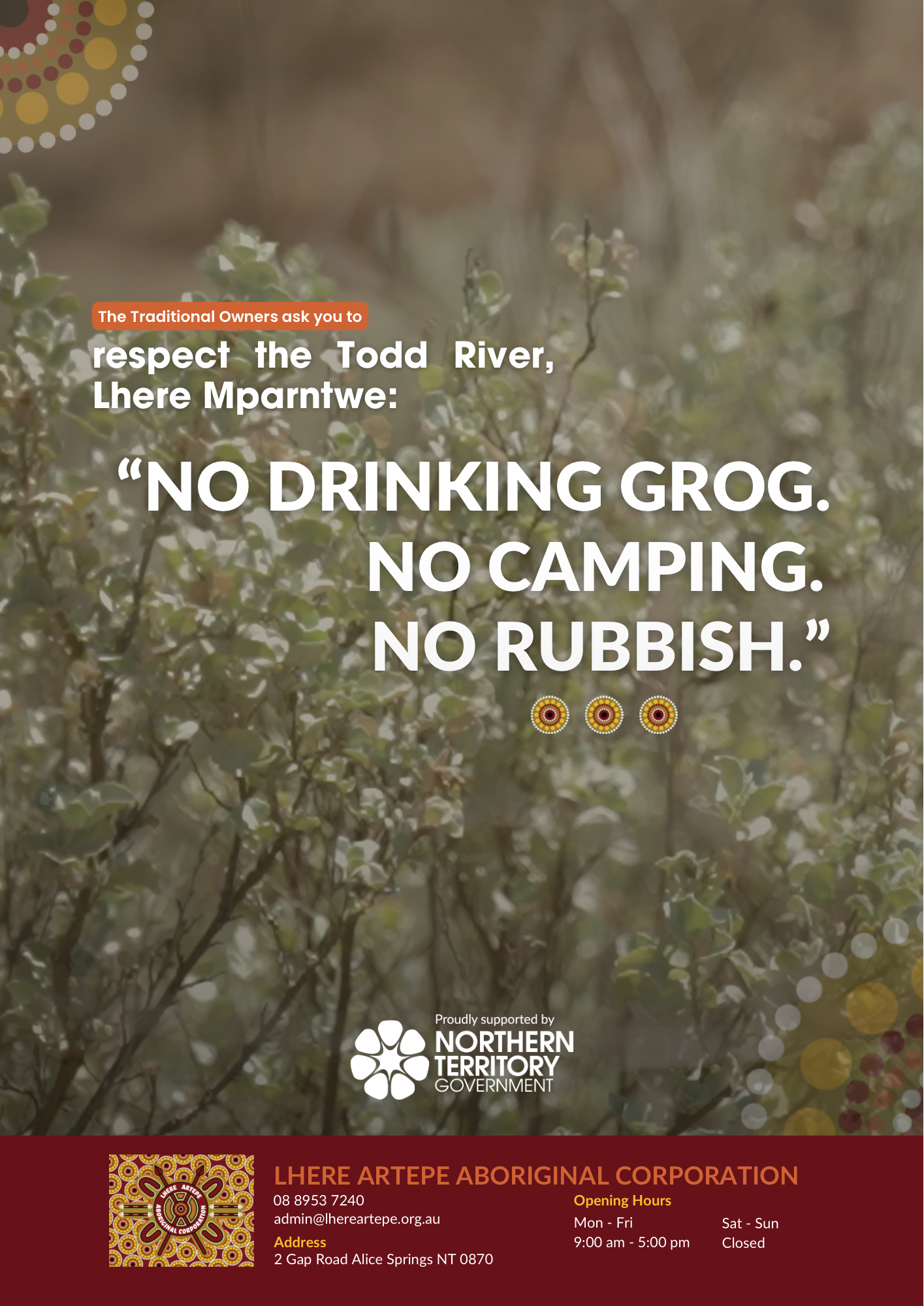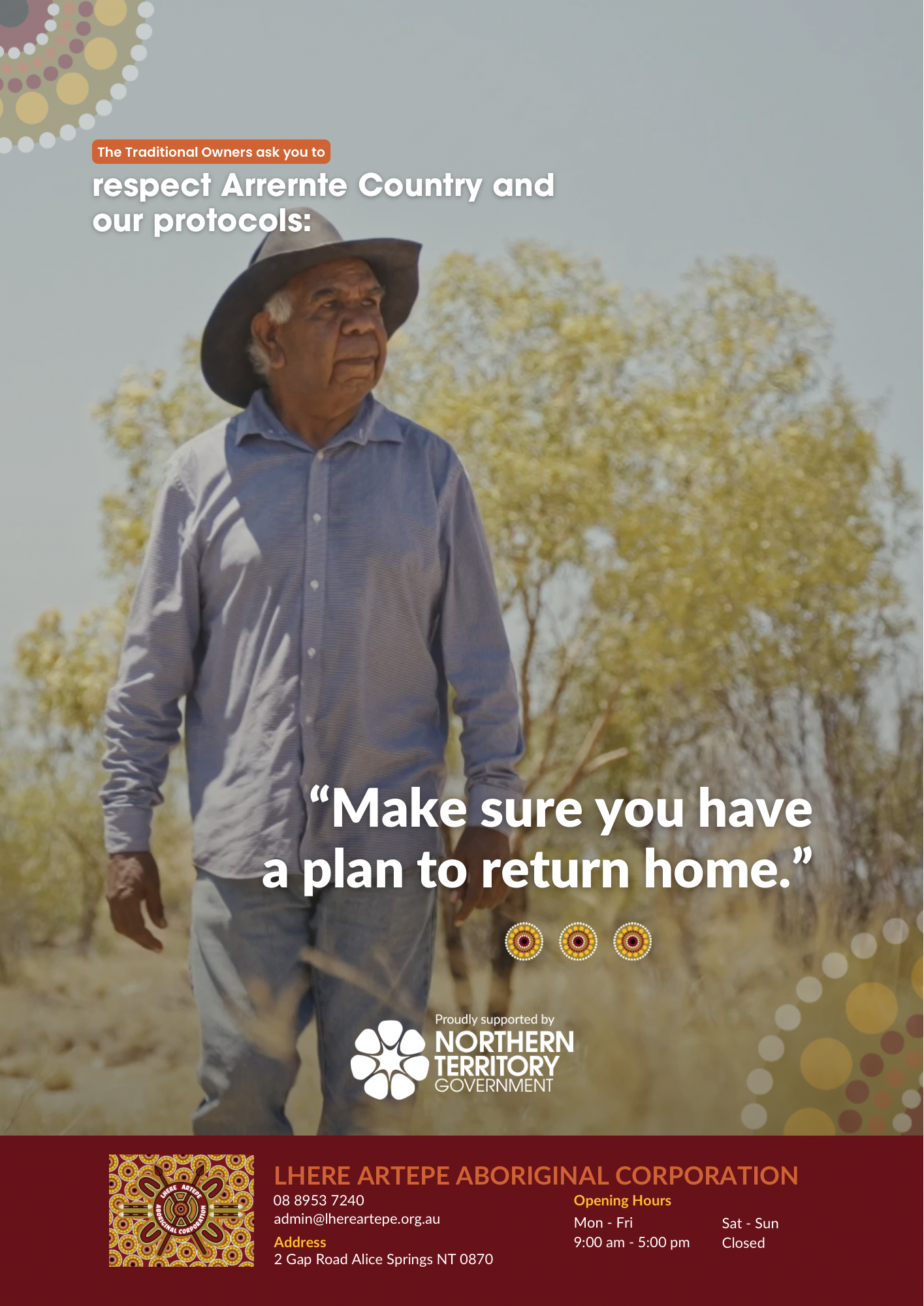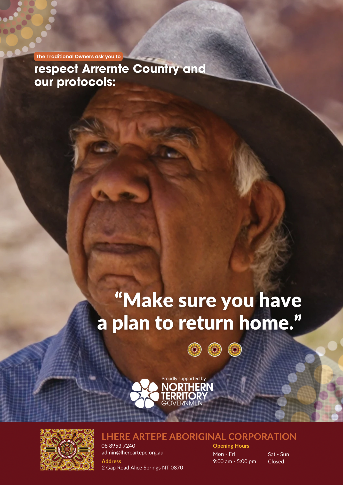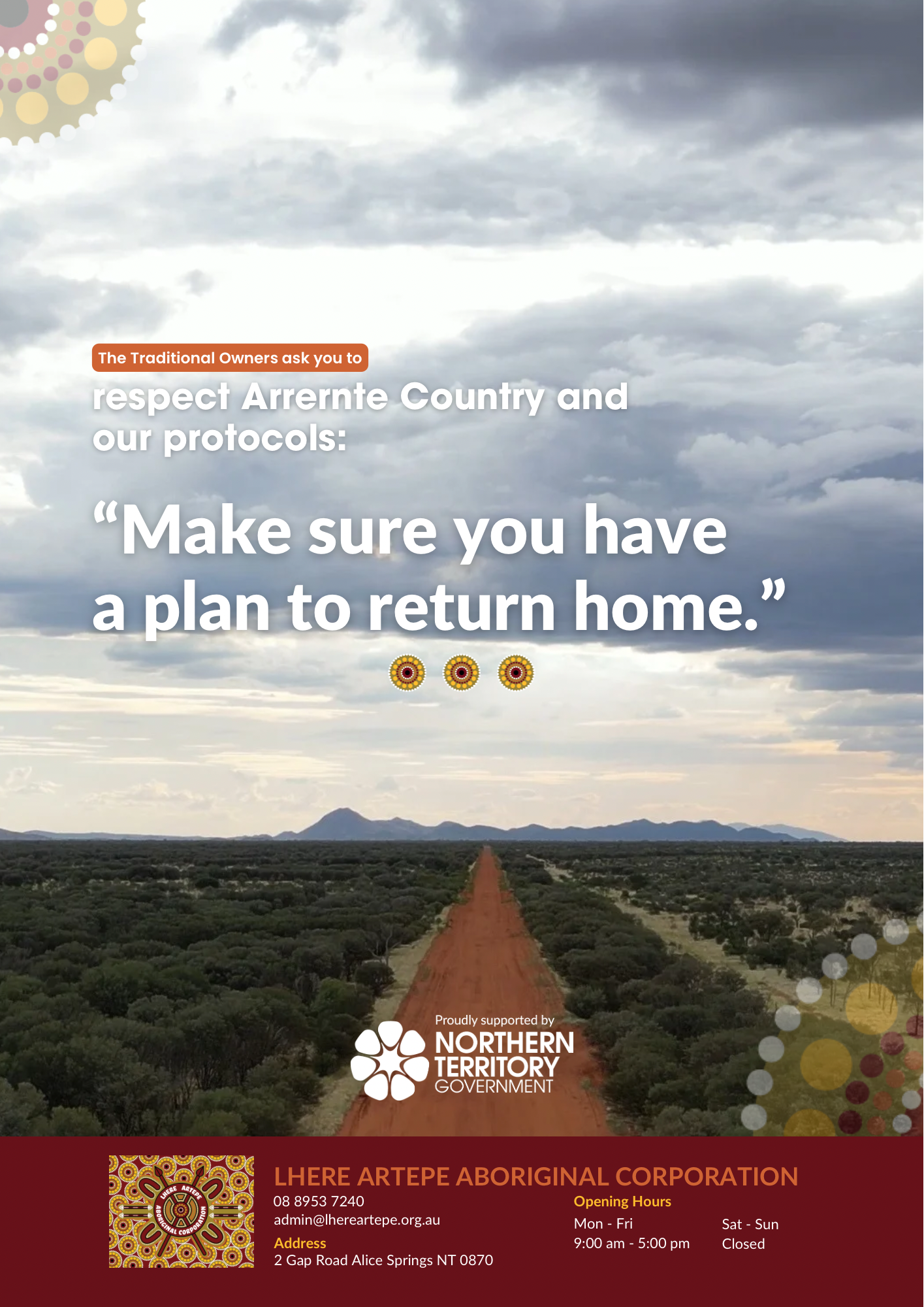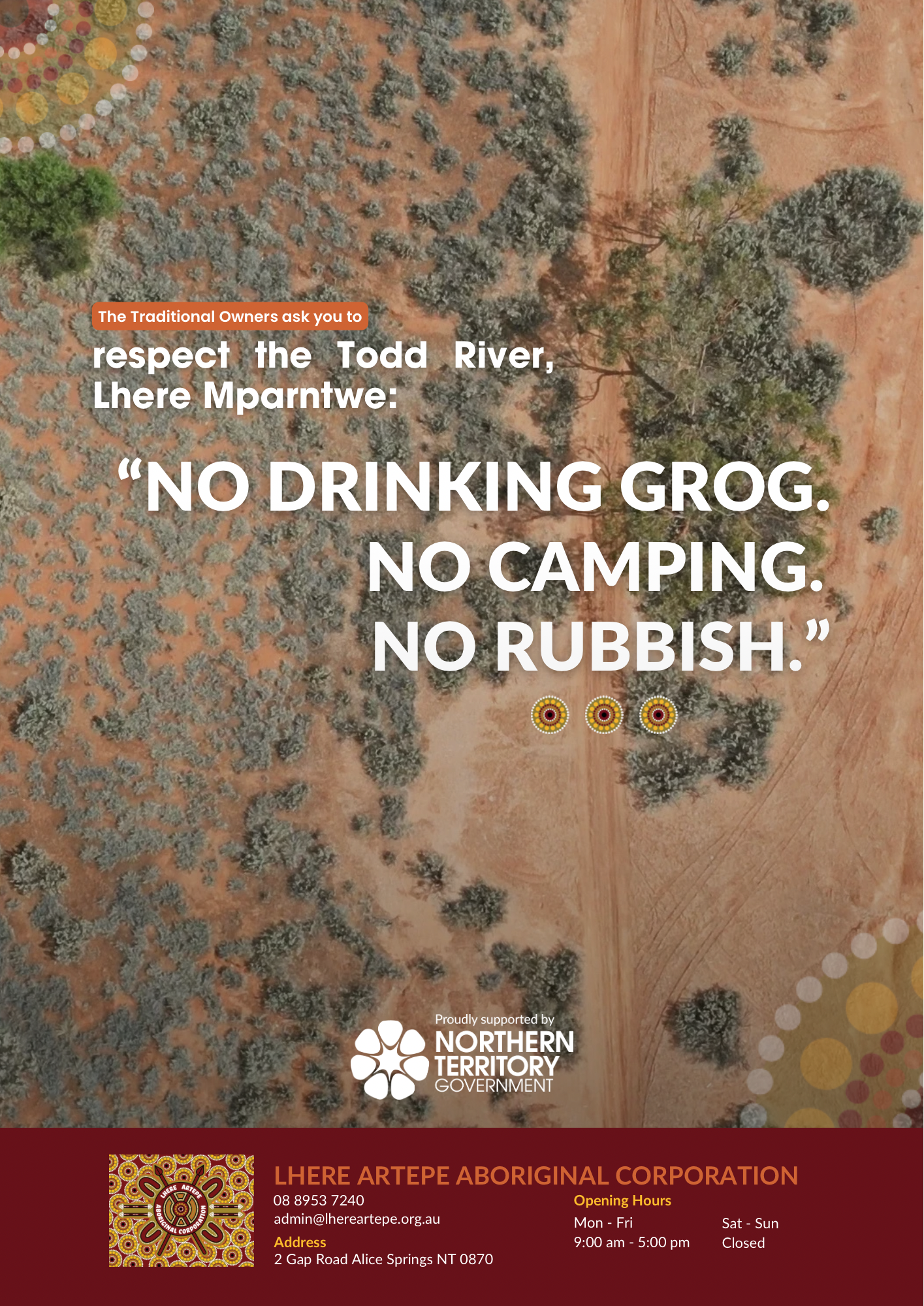Lhere Artepe Aboriginal Corporation is the Registered and recognised Prescribed Body Corporate representing the Native Title Holders of Alice Springs following their court determination ruling and registered Incorporated body in 2002.